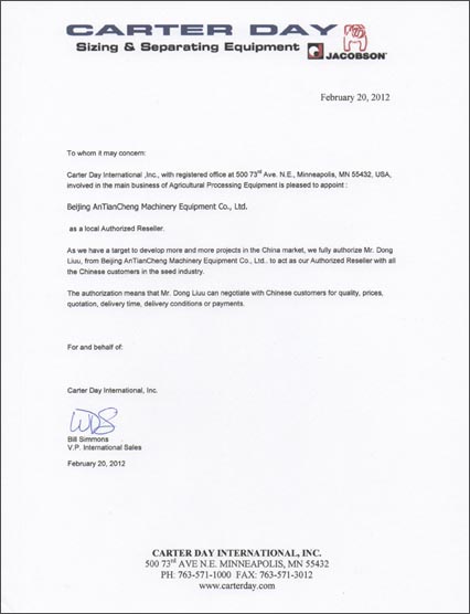 Carter Day公司充分授權(quán)北京安田成機(jī)械設(shè)備有限公司的劉東先生,在中國種業(yè)作為Carter Day公司的授權(quán)經(jīng)銷商。作為中國種業(yè)的授權(quán)經(jīng)銷商,我們有一個(gè)共同的目標(biāo)就是開發(fā)更多的項(xiàng)目在中國市場,對于CarterDay公司旗下所有產(chǎn)品,劉東先生代表Carter Day公司可以與中國客戶有權(quán)進(jìn)行質(zhì)量交涉、價(jià)格、報(bào)價(jià)、交付時(shí)間、交付或付款等等事項(xiàng)。